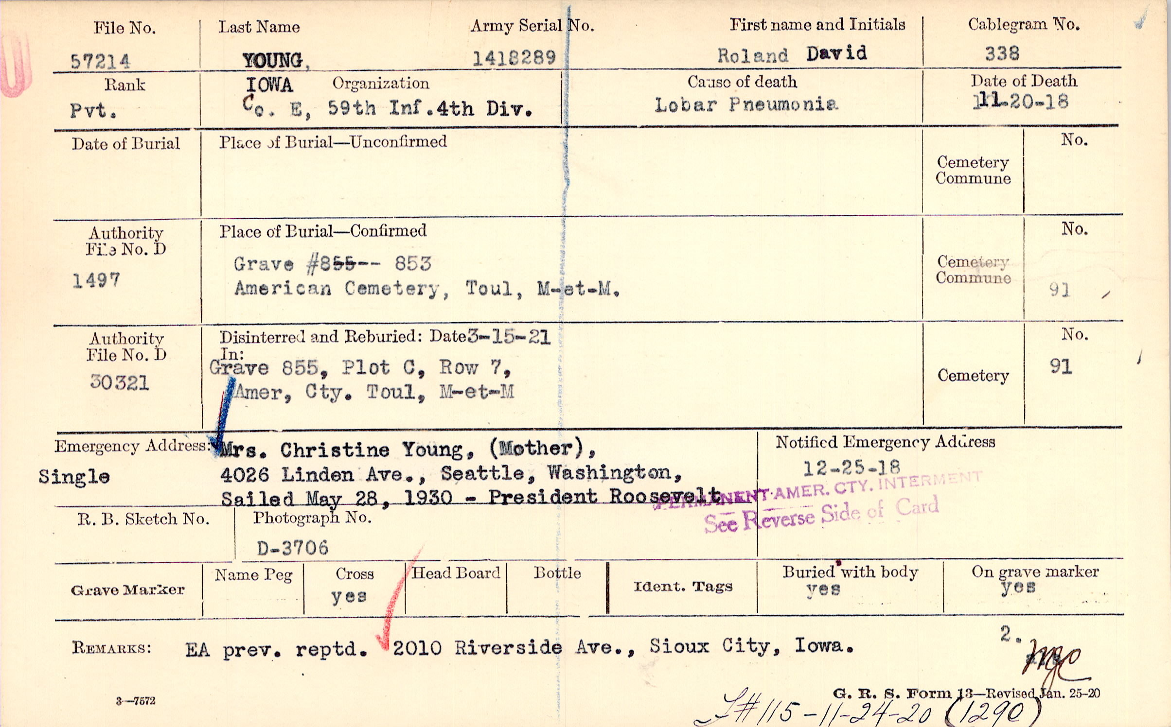 Grave 855, Row 7, Plot C, American Cemetery, Justice Hospital Group, Toul, Meurthe-et-Moselle