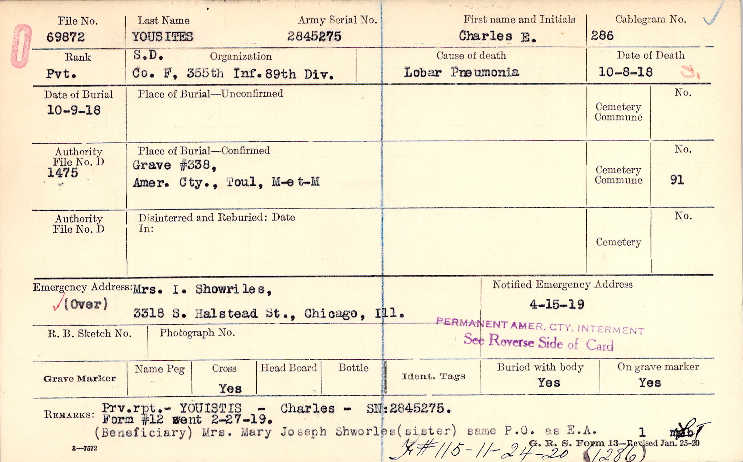 Prv. rpt. - YOUISTIS - Charles - SN: 2845275. (Beneficiary) Mrs. Mary Joseph Shworles (sister) same P.O. as E.A., Form #12 sent 2-27-19., F#115 - 11-24-20 (1286)