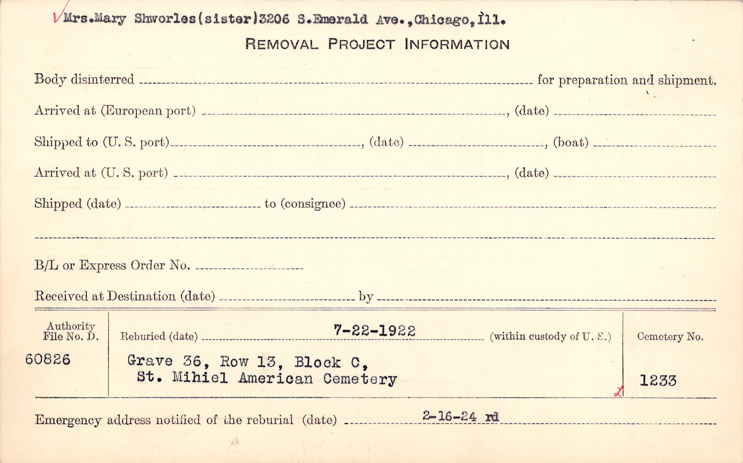 Mrs. Mary Shworles (sister) 3206 S. Emerald Ave., Chicago. Ill. |