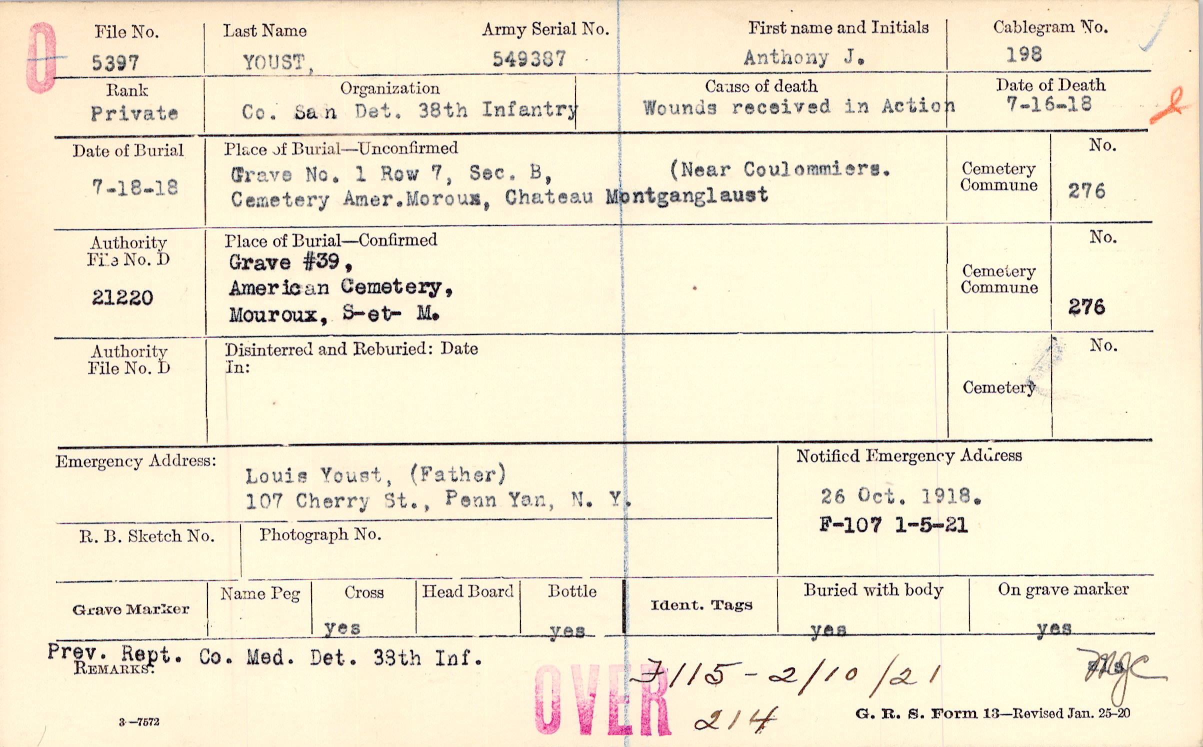 Louis Youst, (Father), 107 Cherry St., Penn Yan, N. Y.