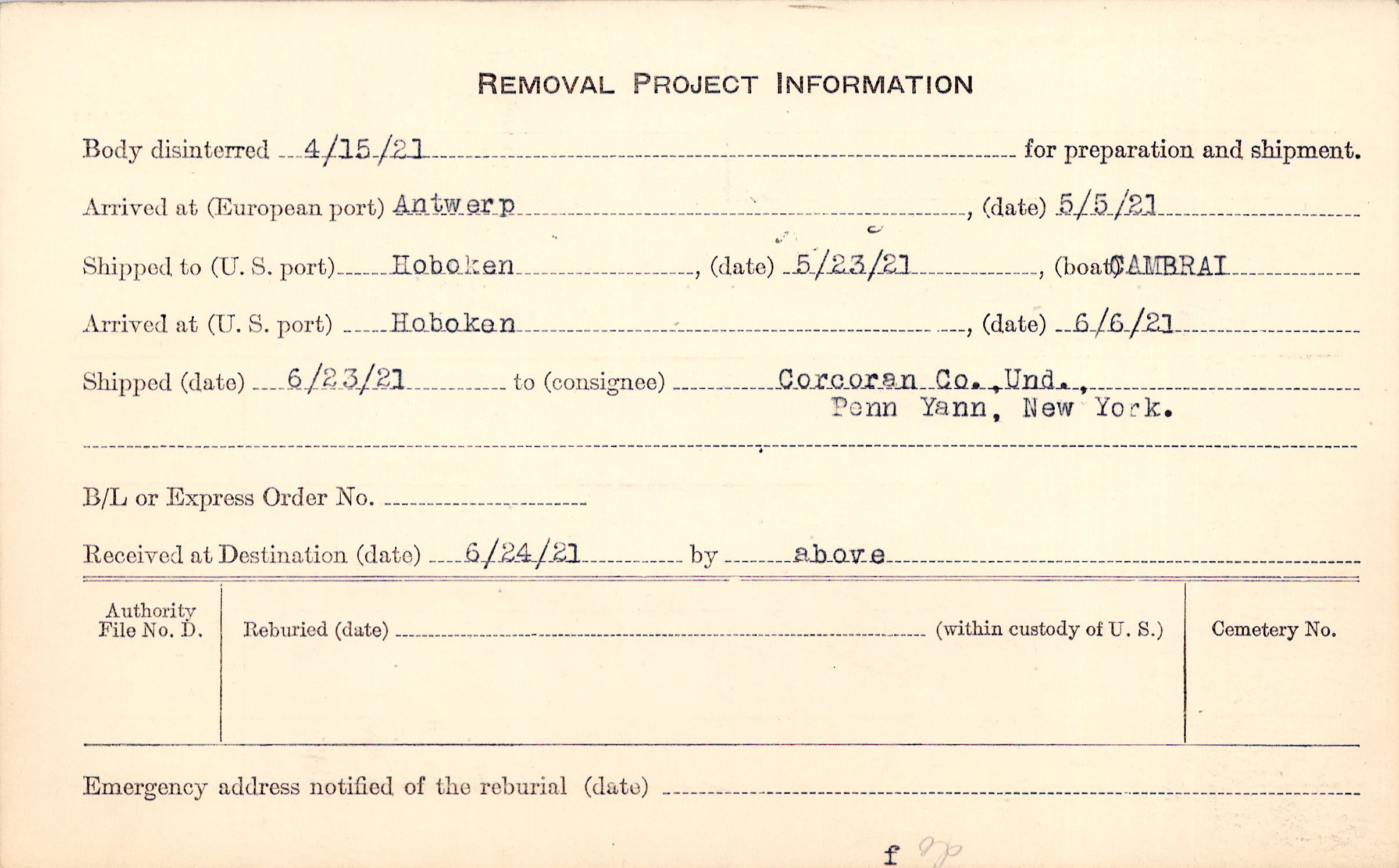 Body disinterred 4/15/1921 for preparation and shipment.