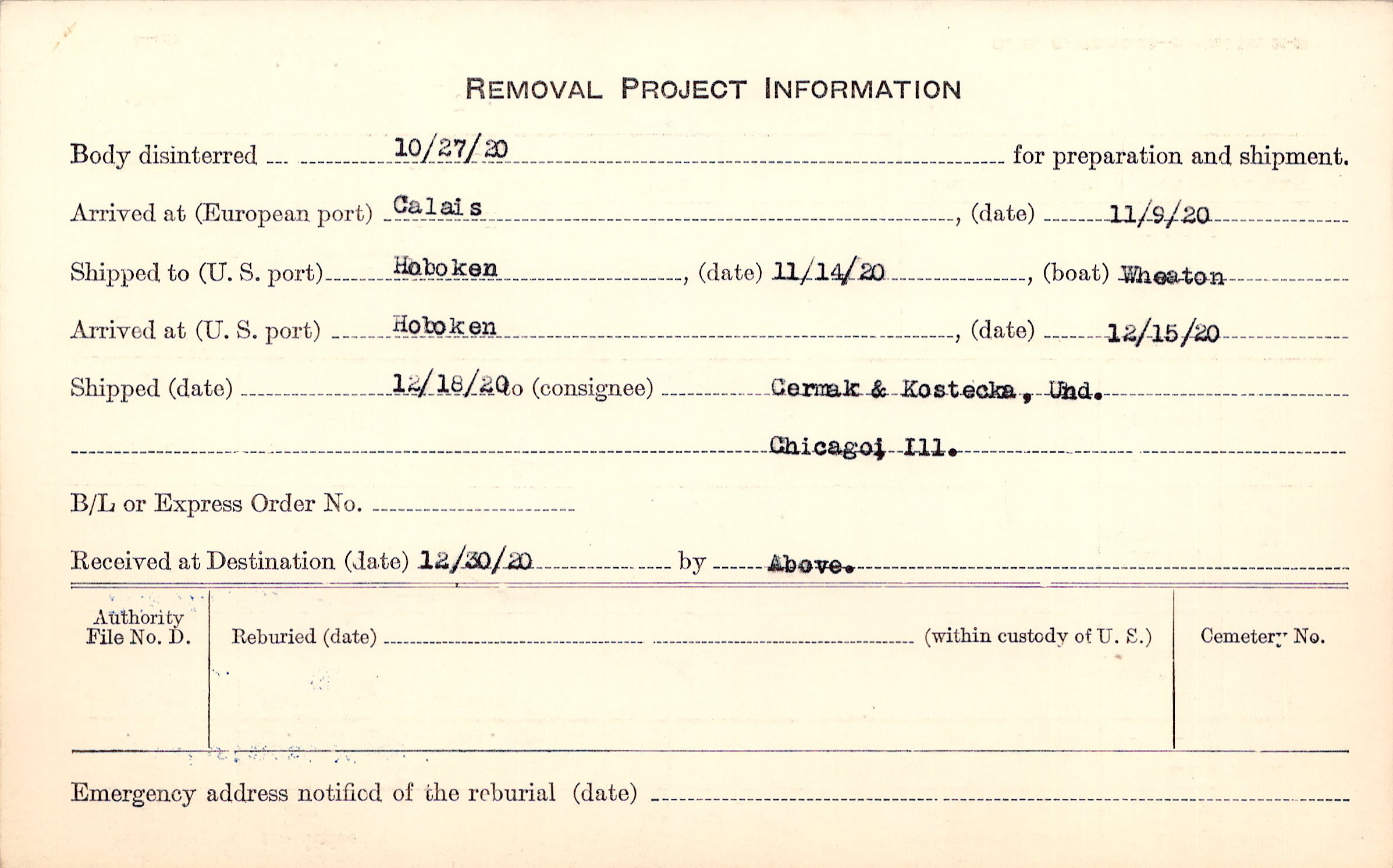 Body disinterred 10/27/1920 for preparation and shipment.