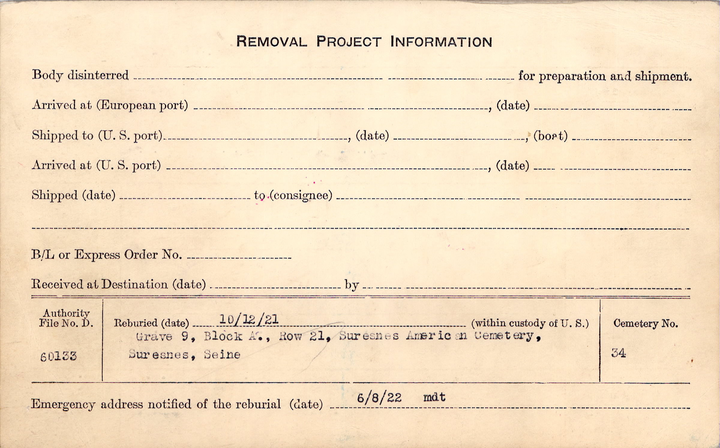 | Permanent Burial in Foreign Cemetery |