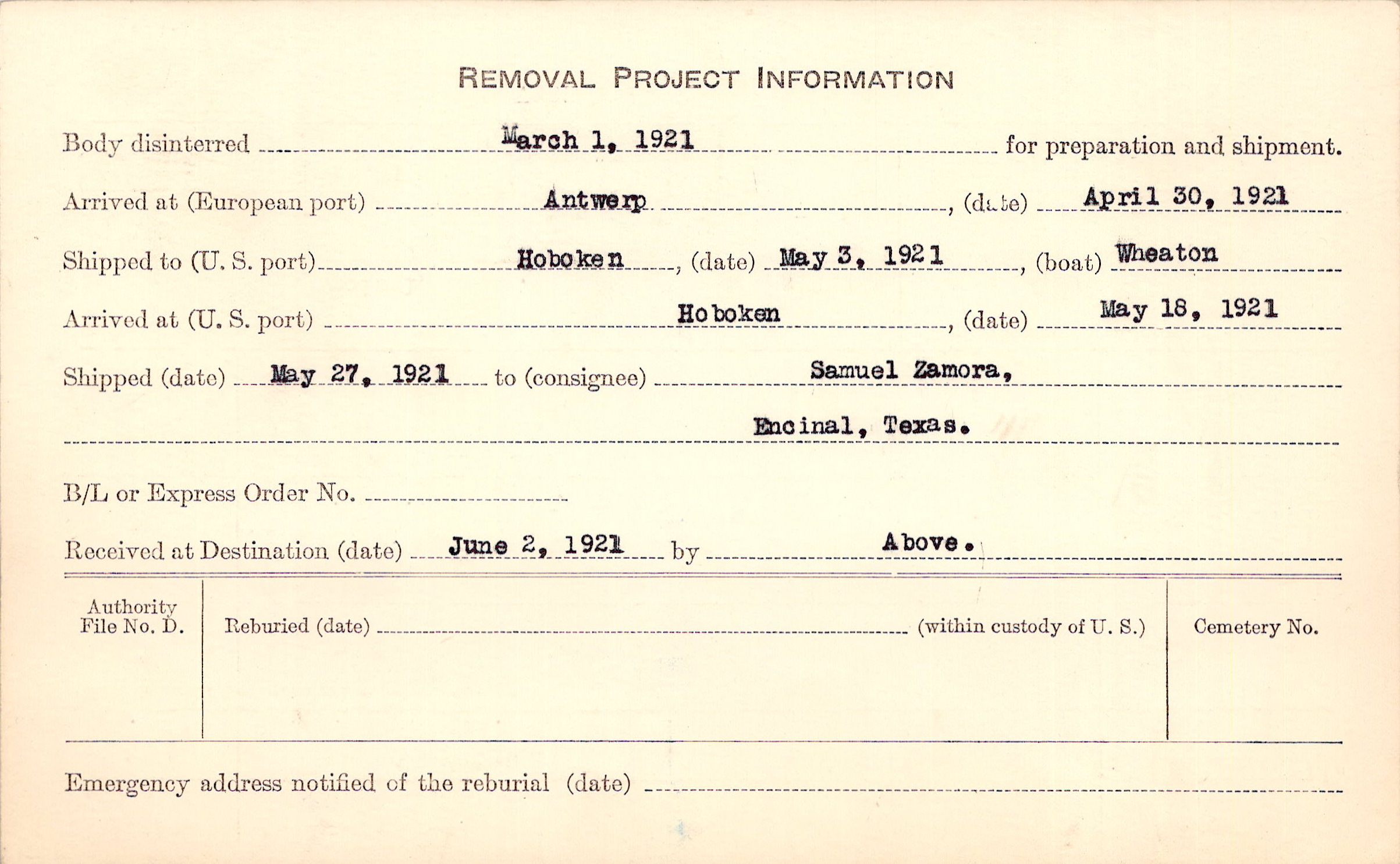 Body disinterred 3/1/1921 for preparation and shipment.