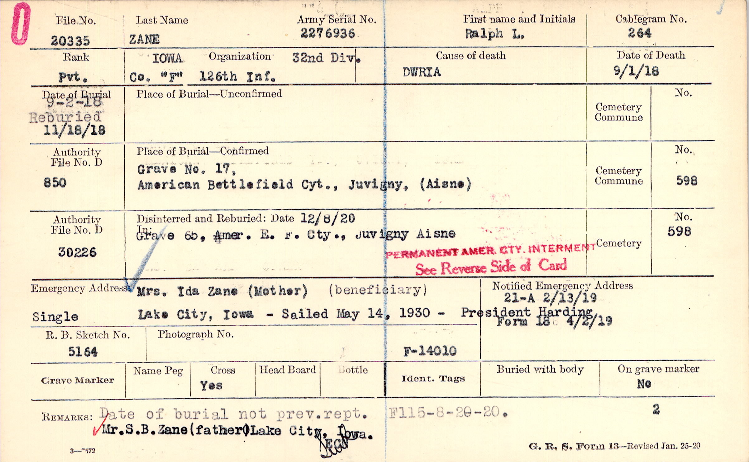 Date of burial not prev. rept. Mr. S.B. Zane (father) Lake City, Iowa., F115 - 8-20-20
