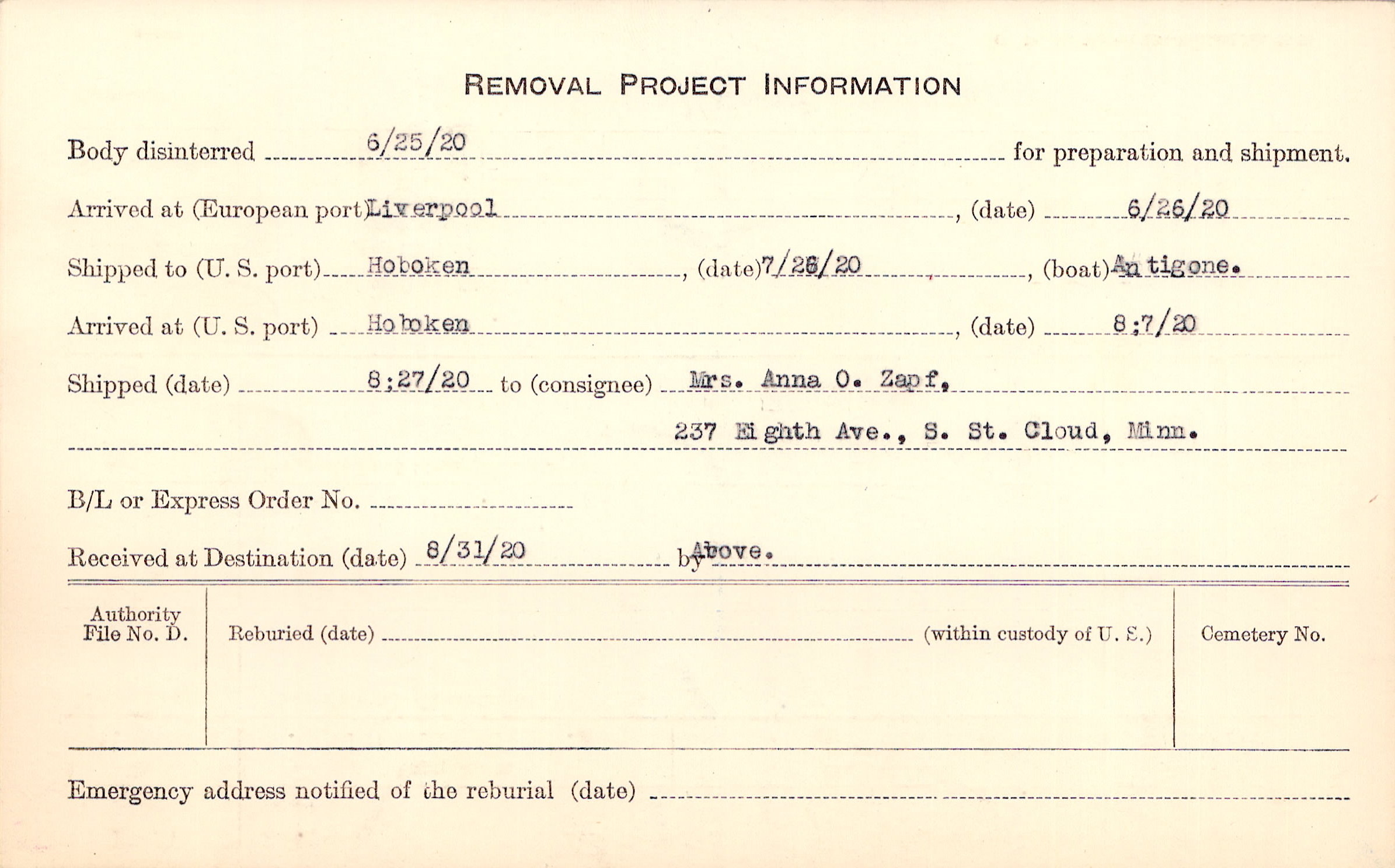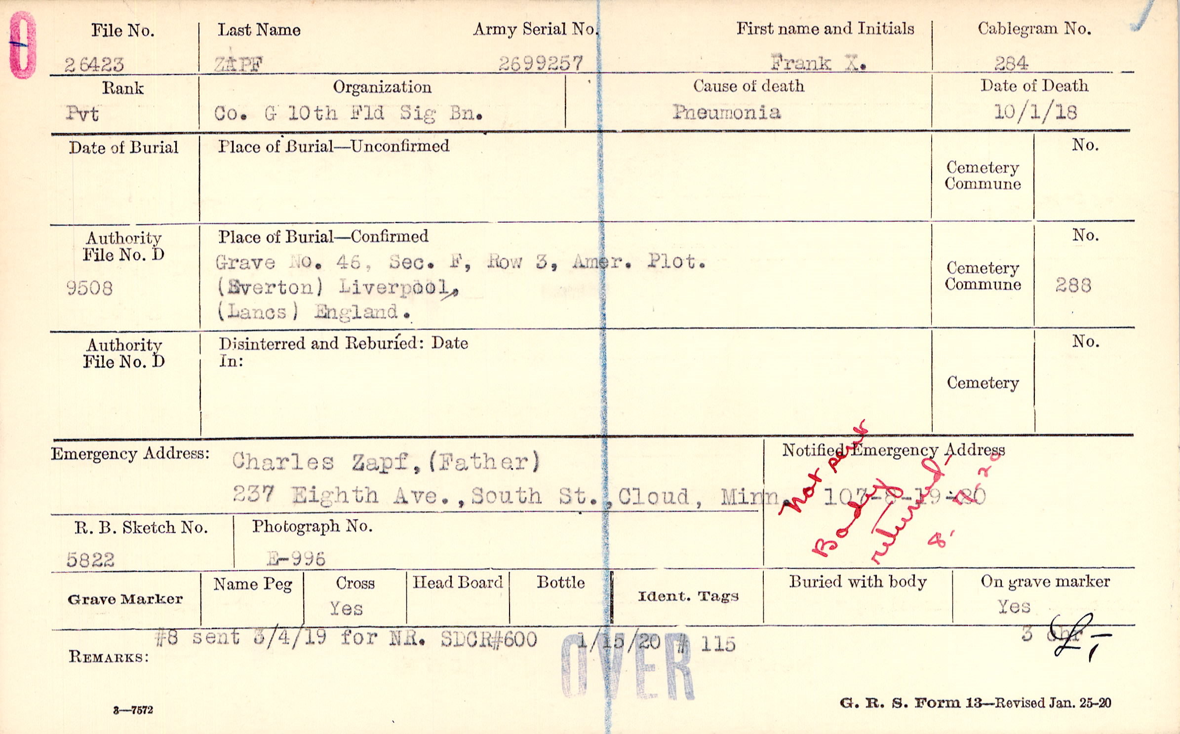 Charles Zapf, (Father), 237 Eighth Ave., South St., Cloud, Minn., Not sent Body Returned 8-7-20