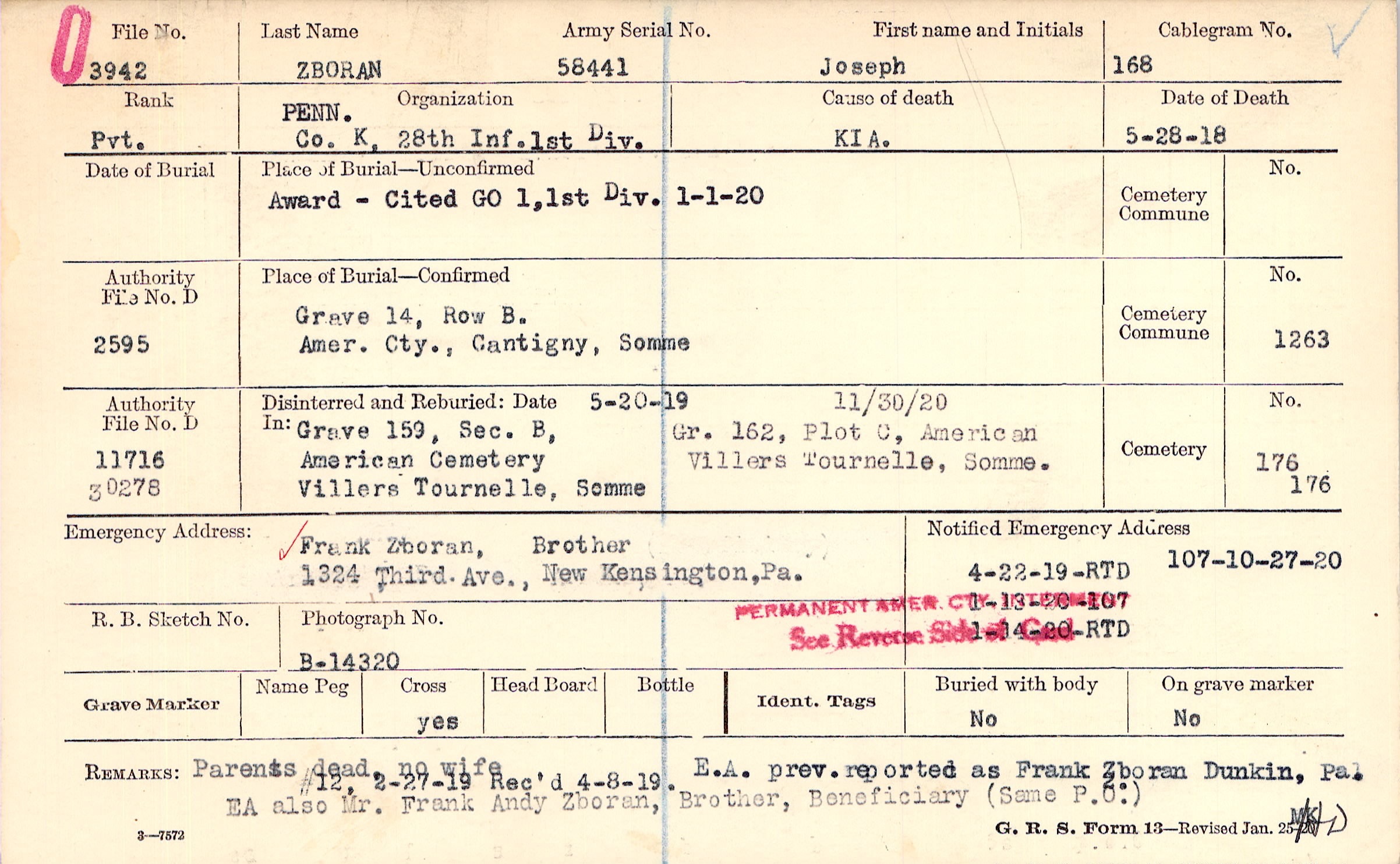 Parents dead, no wife EA also Mr. Frank Andy Zboran, Brother, Beneficiary (Same P.O.) E.A. prev. reported as Frank Zboran Dunkin, Pa., #12, 2-27-19 Rec'd 4-8-19