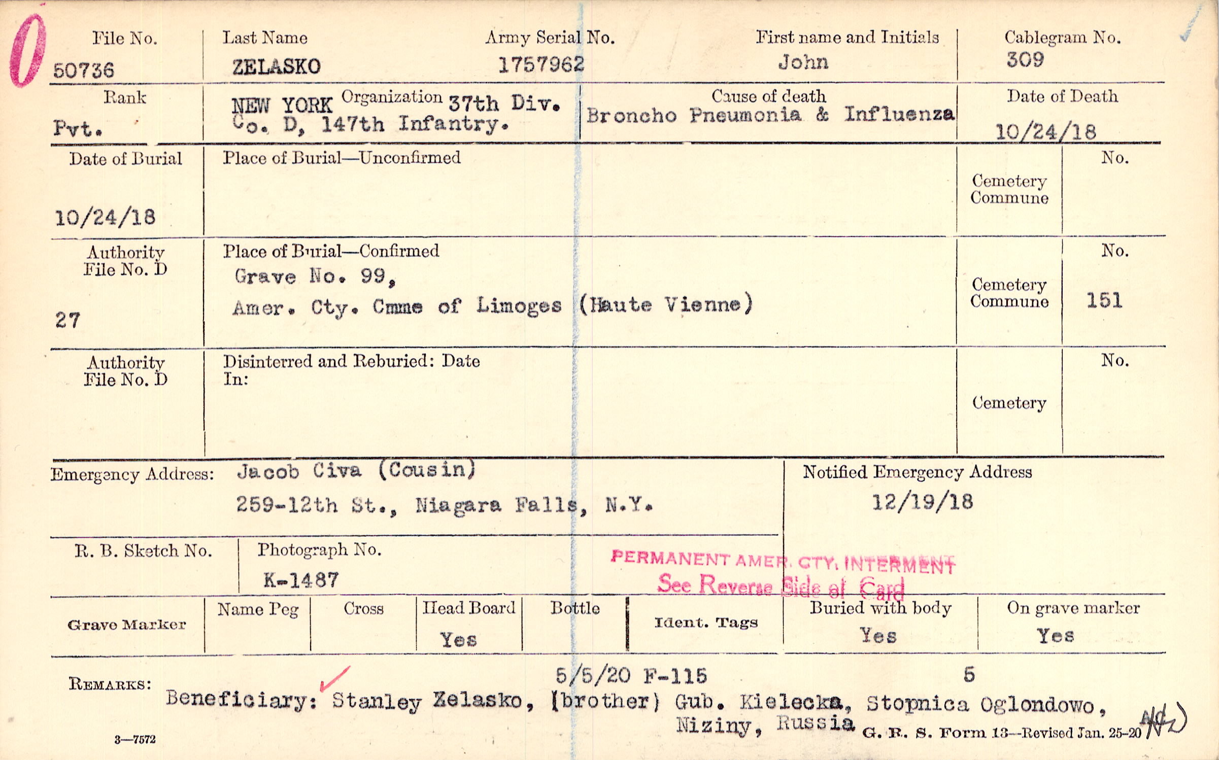 Grave NO. 99, Amer. Cty., Cmme of Limoges, Haute Vienne