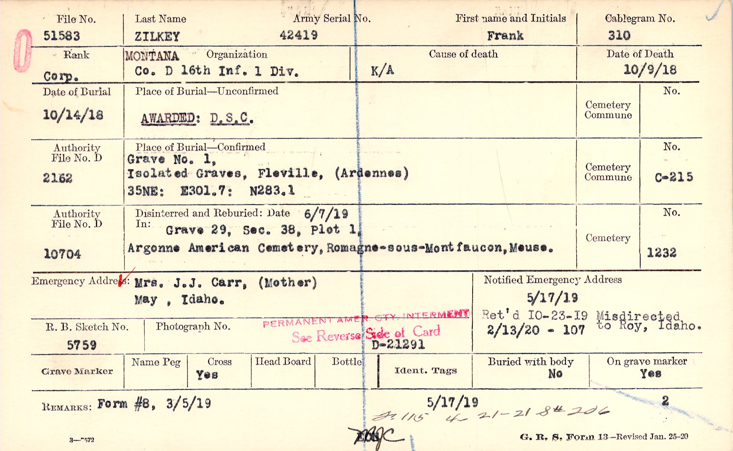 5/17/1919, Ret'd 10/23/1919 Misdirected to Roy, Idaho, Form 107: 2/13/1920
