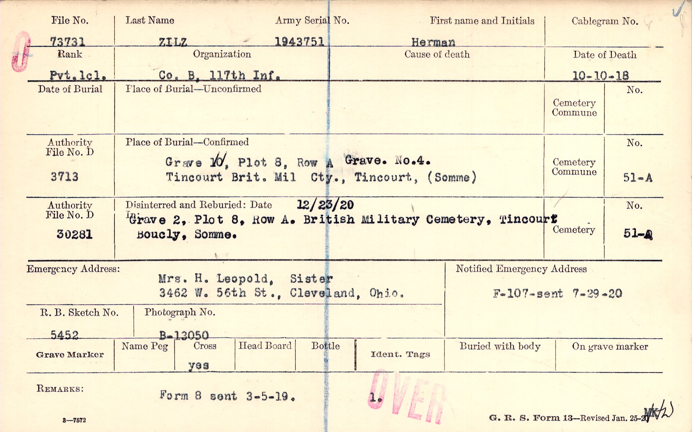 Grave 10, Plot 8, Row A Grave. 4. Tincourt Brit. Mil Cty., Tincourt, (Somme)