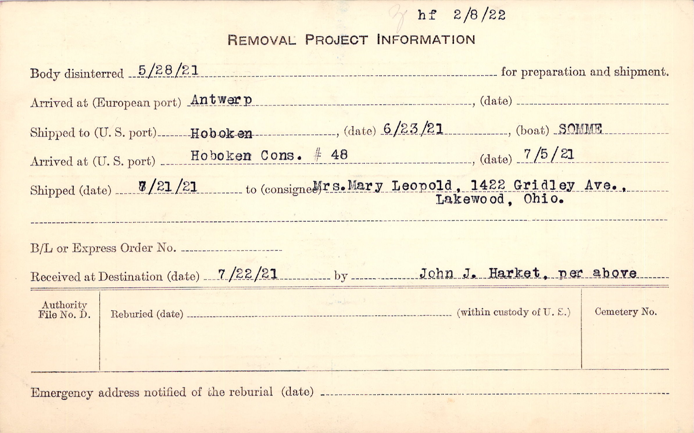 Body disinterred 5/28/1921 for preparation and shipment.