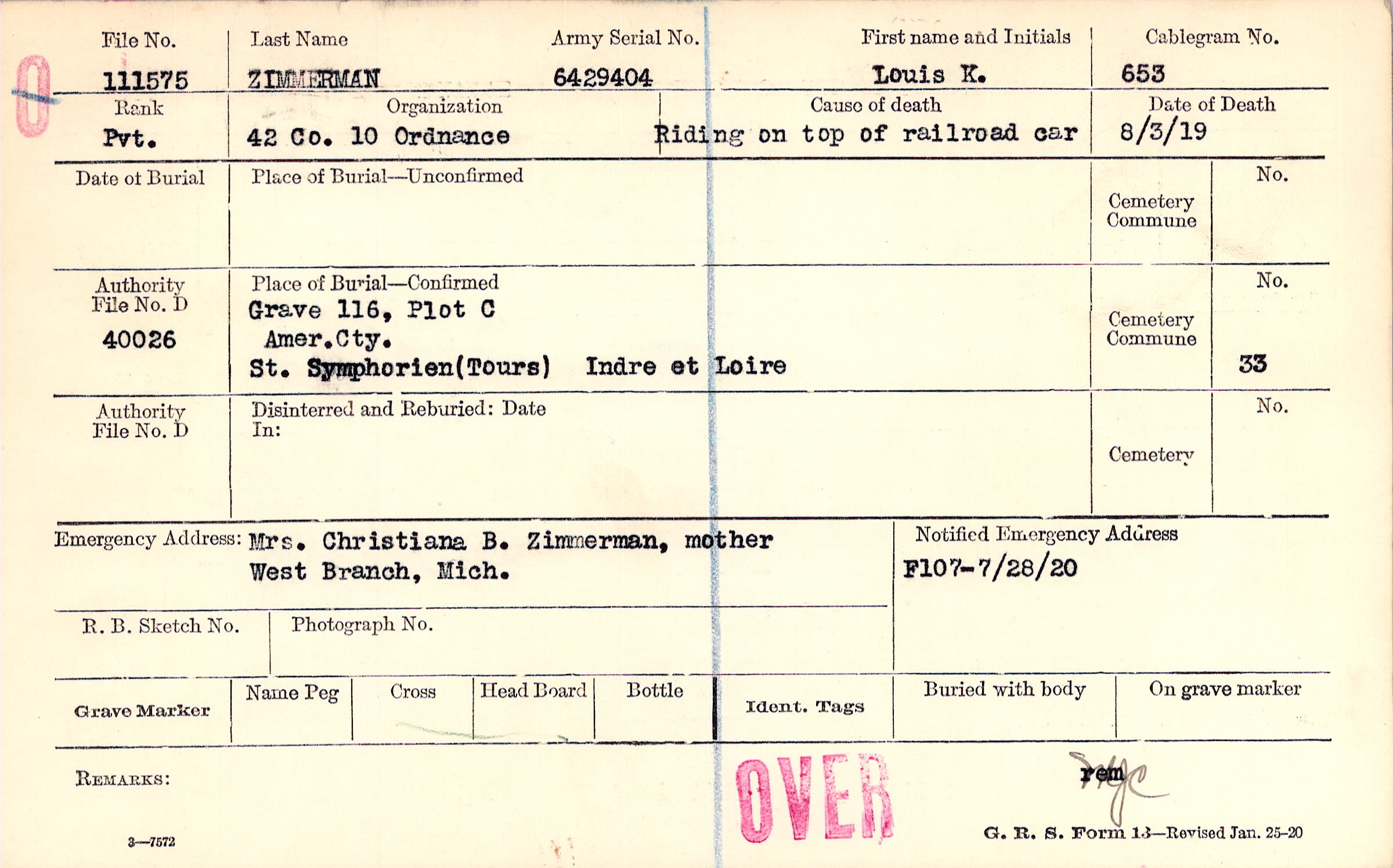 Grave 116, Plot C, Amer. Cty., St. Symphorien, Tours, Indre et Loire.