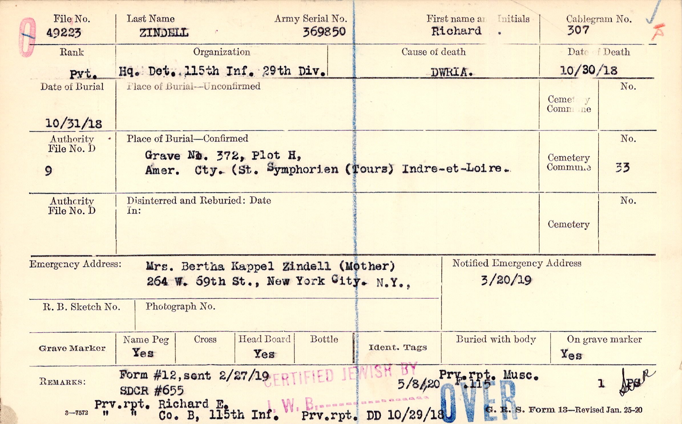 Mrs. Bertha Kappel Zindell (Mother), 264 W. 69th St., New York City. N.Y.,