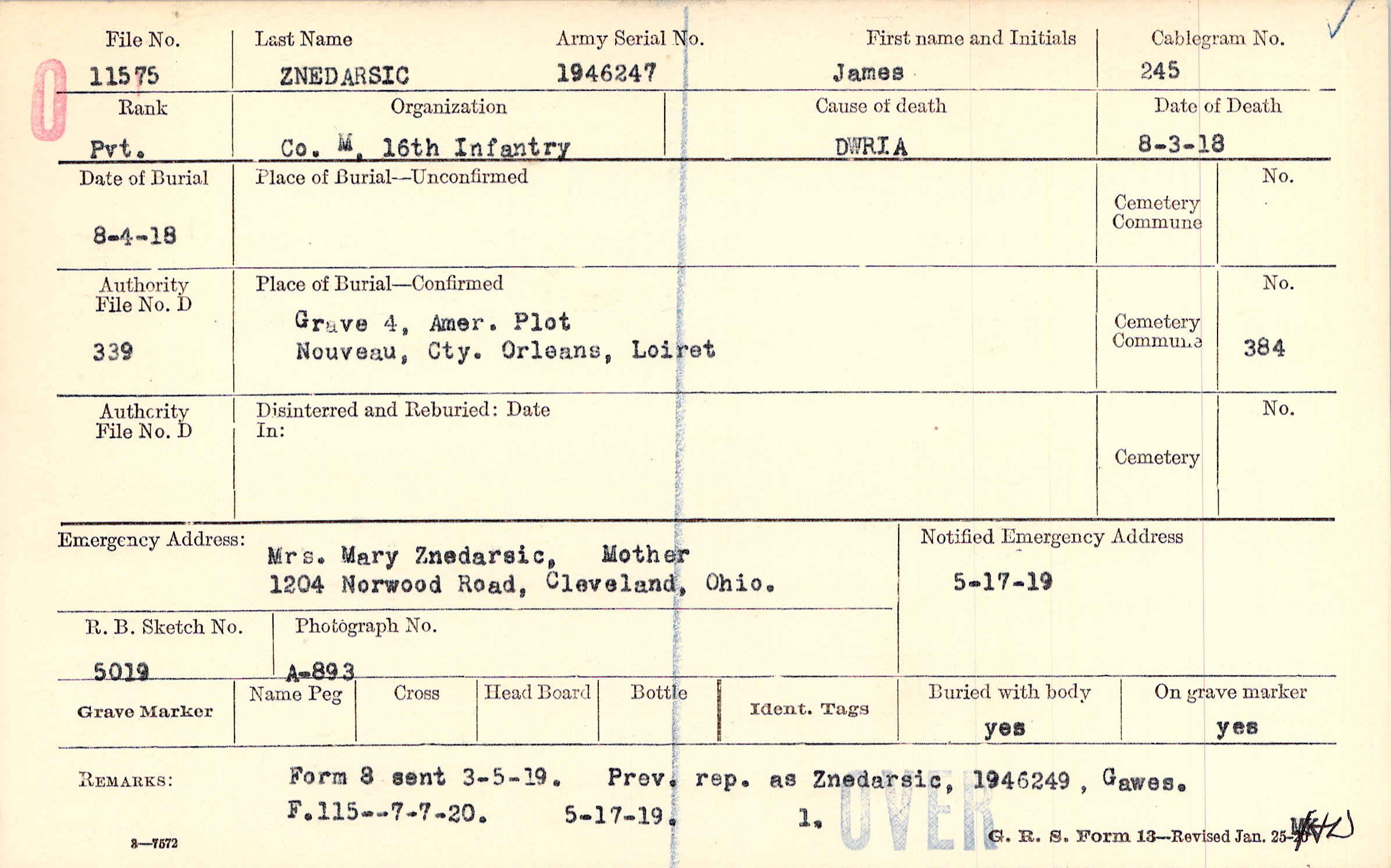 Mrs. Mary Znedarsic, Mother, 1204 Norwood Road, Cleveland, Ohio.