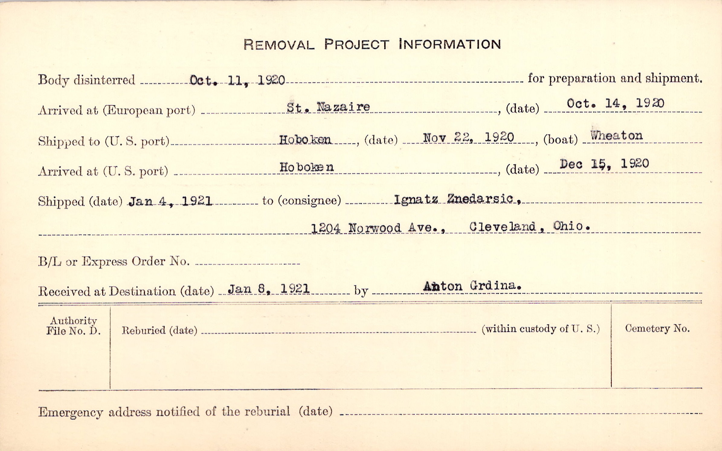 Body disinterred 10/11/1920 for preparation and shipment.