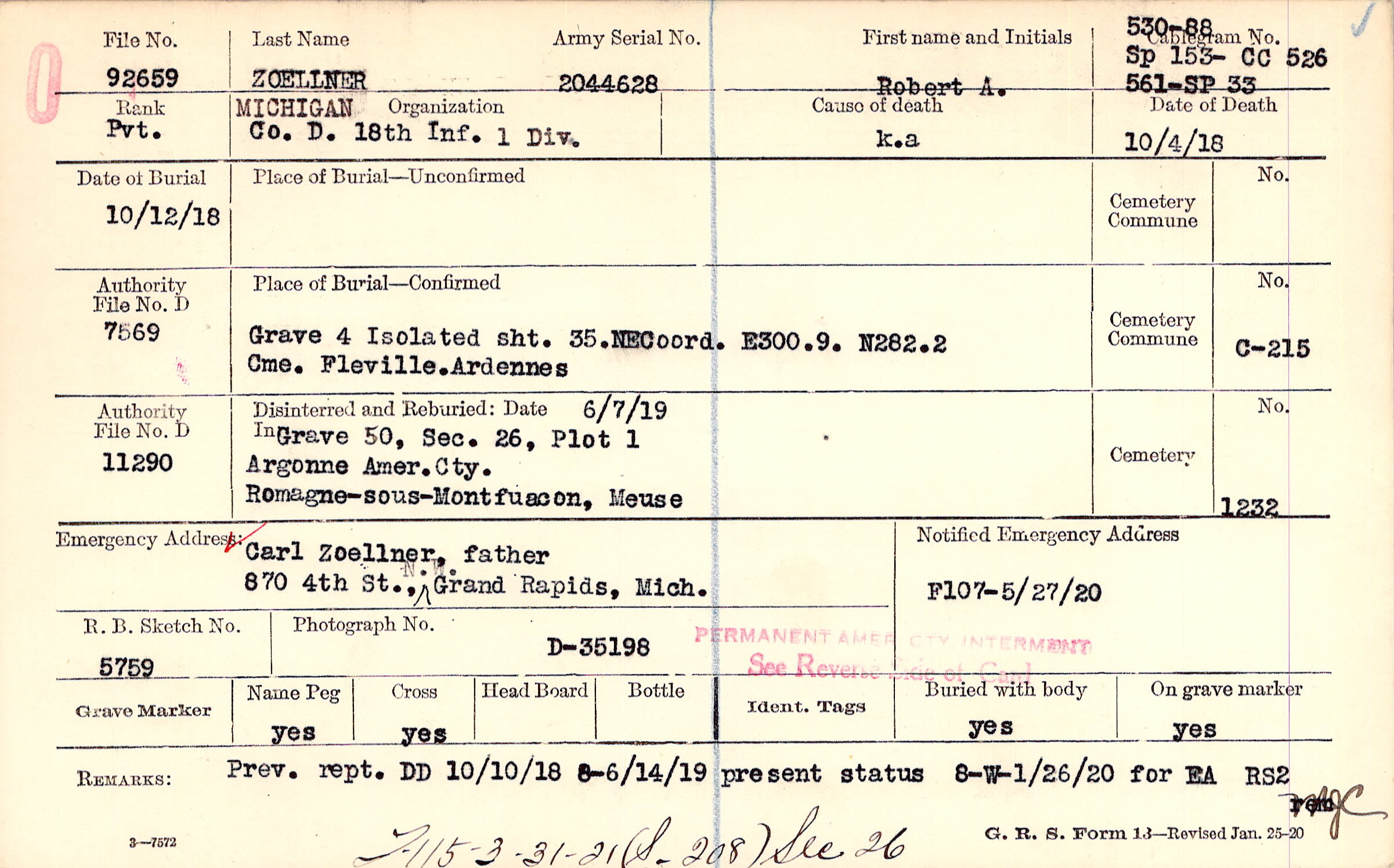 Carl Zoellner, father, 870 4th St., N.W. Grand Rapids, Mich.