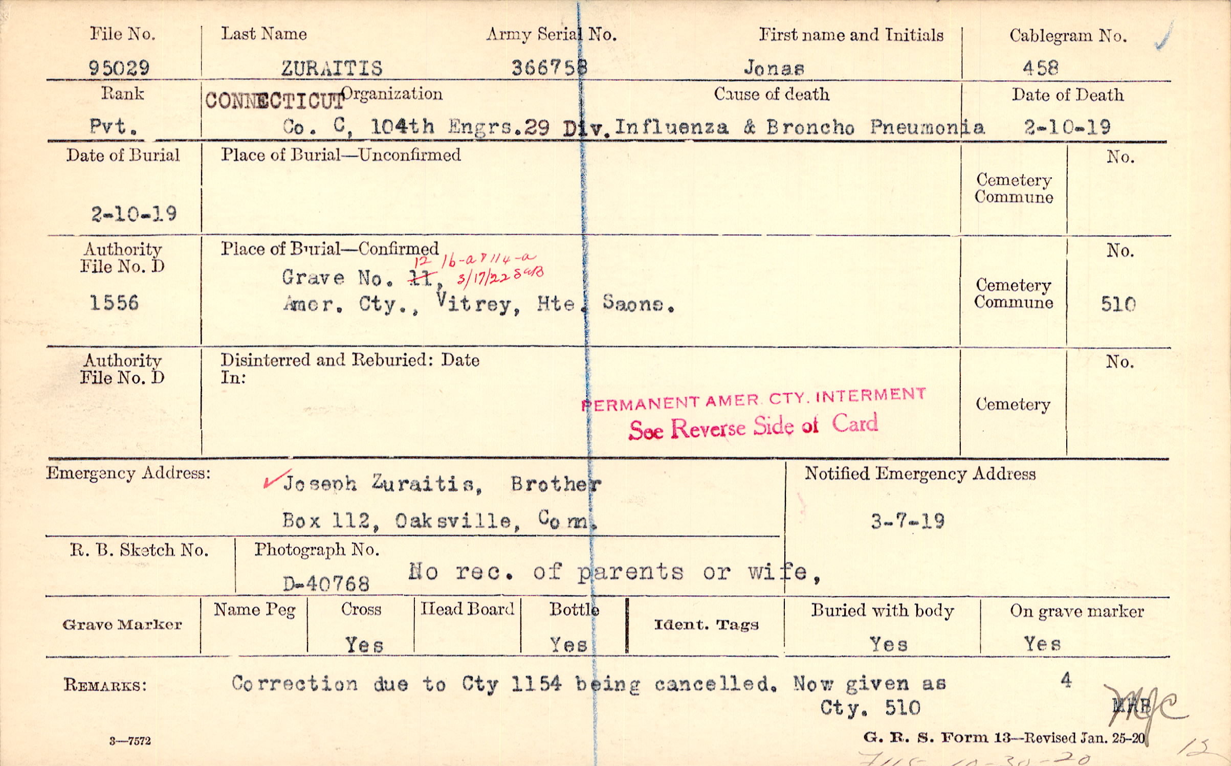 Joseph Zuraitis, Brother, Box 112, Oaksville, Conn, No rec. of parents or wife,